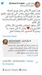 وأعربت نوال الزغبي عن غضبها من محاولة اقحام إسمها في خلافات مع اصدقائها الفنانين، موجهة رسالة شديدة اللهجة لصاحب التدوينة قائلة:”هيدا تزوير !!! واللي عامل هيدي الحركة شخص فعلا مريض ونفس اللي عم يزوّر حقايق حفل دار الاوبرا”.