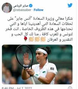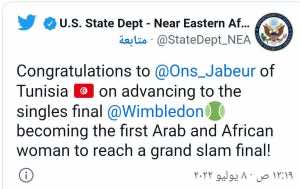 وقال حساب قسم الشرق الأدنى في وزارة الخارجية الأمريكية على تويتر: “مبروك لأنس جابر على التأهل، فقد أصبحت أول امرأة عربية وأفريقية تصل إلى نهائي غراند سلام”، بعدما اشعلت مواقع التواصل الاجتماعي.
