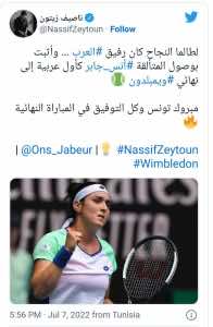 وعلق المغني السوري، ناصيف زيتون، على إنجاز البطلة التونسية في بطولة ويمبلدون قائلا: ”لطالما النجاح كان رفيق العرب، وأثبت بوصول المتألقة أنس جابر كأول عربية إلى نهائي ويمبلدون، مبروك تونس وكل التوفيق في المباراة النهائية”.
