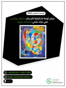 ويتبرع الرسام المغربي سفيان بوكرين في المزاد العلني، بلوحة تشكيلية ليست هي الأولى في رصيده الفني المسخر للأعمال الخيرية، إذ سبق وتبرع بلوحات فنية عديدة لفائدة الجمعية ومؤسسات خيرية أخرى.