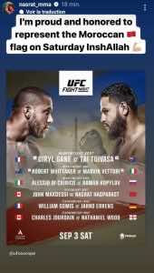 ويرتقب أن يواجه ليلة السبت 03 شتنبر المقبل، خصمه الكندي “جون ماكديسي”، عن وزن ( 66-70)، ضمن أمسية “UFC FIGHT NIGHT”، بالعاصمة الفرنسية باريس.