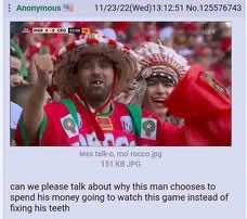 وتم تداول واسع على منصة الفايسبوك، لصورة نشرت على صفحة أمريكية تتنمر على المشجع المغربي، حيث أرفقت صورته بتعليق جاء فيه: “هل يمكننا الحديث عن كيف اختار هذا الرجل أن يهدر ماله لمشاهدة المباراة عوض أن يصلح أسنانه”.