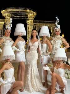 ورافق السفير بسام فريحة والسياسي الإماراتي والملياردير المعروف، صوفيا سعيدي لحظة ممشاها على الممر، مرتدية فستان زفافها الأبيض، تحيطها عائلتها والأقارب والأصدقاء.
