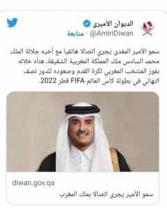 وأفاد حساب الديوان الأميري على موقع “تويتر”، بأن ملك المغرب أعرب من جانبه، عن شكره وتقديره لأمير قطر على مشاعره الطيبة، متمنيا النجاح والتوفيق لدولة قطر في تنظيم ما تبقى من منافسات البطولة العالمية.