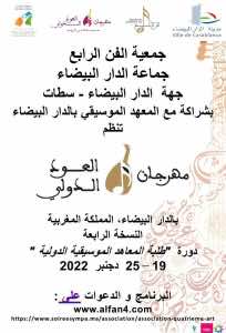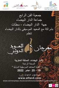 تنظم جمعية الفن الرابع برئاسة محسن بوفتال ومقاطعة الدار البيضاء، النسخة الرابعة من المهرجان الدولي لآلة العود، تحت شعار “دورة طلبة المعاهد الموسيقية الدولية”، وذلك في الفترة الممتدة من 19 إلى 25 دجنبر 2022.