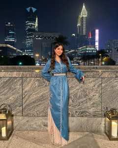 وأطلت الفنانة السعودية أسيل عمران بقفطان أنيق وناعم من تشكيلة المصممة سلمى بنعمر، حيث اختارت إطلالة باللون التركواز، بتصميم مستقيم يبرز القوام، مزين بتطريزات ورود زهرية جانبية مع تفصيل من الدانتيل البيج في الأطراف السفلية، أرفقته بحزام فضي، مع تسريحة شعر “ويفي” مسندلة على الكتف وماكياج خفيف ناعم.