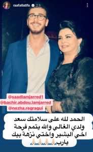 - من جانبها، شاركت لطيفة رأفت صورة تجمعها بسعد لمجرد، وعلقت عليها قائلة: “الحمد لله على سلامتك ابني سعد، ولدي الغالي أتمنى من الله أن يتمم فرحة أخي البشير وأختي نزهة”.
