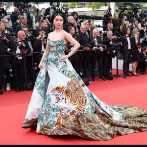 بدورها، ظهرت الفنانة الصينية، فان بينغ بينغ، بإطلالة خارجة عن المألوف، أثارت اهتمام عدسات الكاميرا على السجادة الحمراء بالمهرجان، حيث ارتدت فستانا طويلا بتصميم لا يحتوي على حمالات، يحمل توقيع المصمم كريستوفر بو، الذي حرص على تكريم الثقافة الصينية من خلال ثوب الفستان، حيث جاء مطبوعا برسومات لأوراق الشجر والنمور والتي ترمز إلى الشجاعة والقوة في الصين.