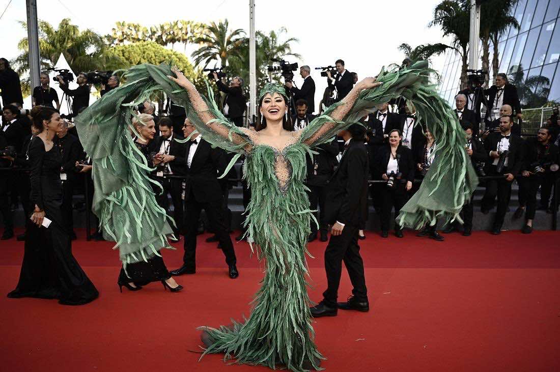 وأثارت الممثلة الروسية، فيكتوريا بونيا، الجدل بعد ظهورها على السجادة الحمراء الأولى لمدينة كان، وهي ترتدي فستانا أخضرا طويلا مغطى بالريش، حيث جاءت إطلالتها شبيهة بالطائر، بعدما اعتمدت على أكمام طويلة تشبه الجناحين والريش الذي يغطي الفستان بأكمله.