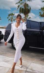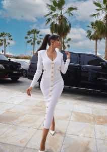 وظهرت الفنانة المغربية في هذا المؤتمر الصحفي، بإطلالة ملفتة، اعتمدت فيها فستانا أبيض يتكون من قطعتين عبارة عن تنورة بيضاء مزينة بأزرار ذهبية أمامية ثم سترة بيضاء بنفس اللون مزينة أيضا بنفس الأزرار مع أكمام طويلة، وجاء الفستان بتصميم ضيق أبرز انحناءات جسمها الجذابة.