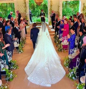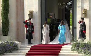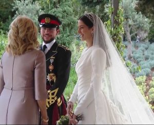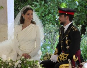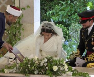وحملت رجوة باقة بسيطة من الزهور البيضاء، واقتصرت أكسسواراتها على أقراط مرصعة بالماس، فيما نسقت هذه الإطلالة الملكية، مع تاج أنيق وفاخر صمم خصيصا لها، ونقش عليه عبارة الملكة رانيا بليلة الحناء “رجوة من الله”.