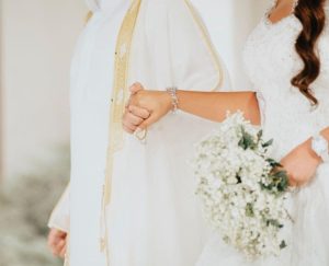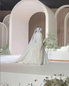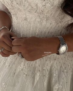 وحمل فستان زفاف الشيخة مهرة توقيع دار “ازرا كوتور” للأزياء الراقية في دبي، أرفقته مع طرحة طويلة من التل المطرز، وزينت إطلالتها بمجوهرات من الألماس وساعة ماسية.